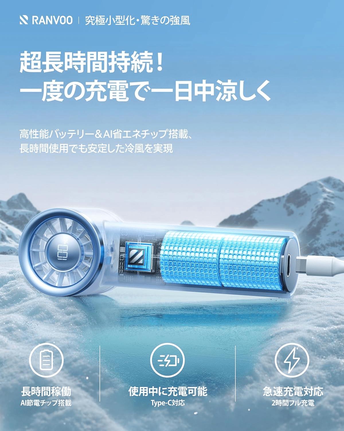 超長時間持続! 一度の充電で一日中涼しく – RANVOO ハンディファン アイスブルー 超軽量強風