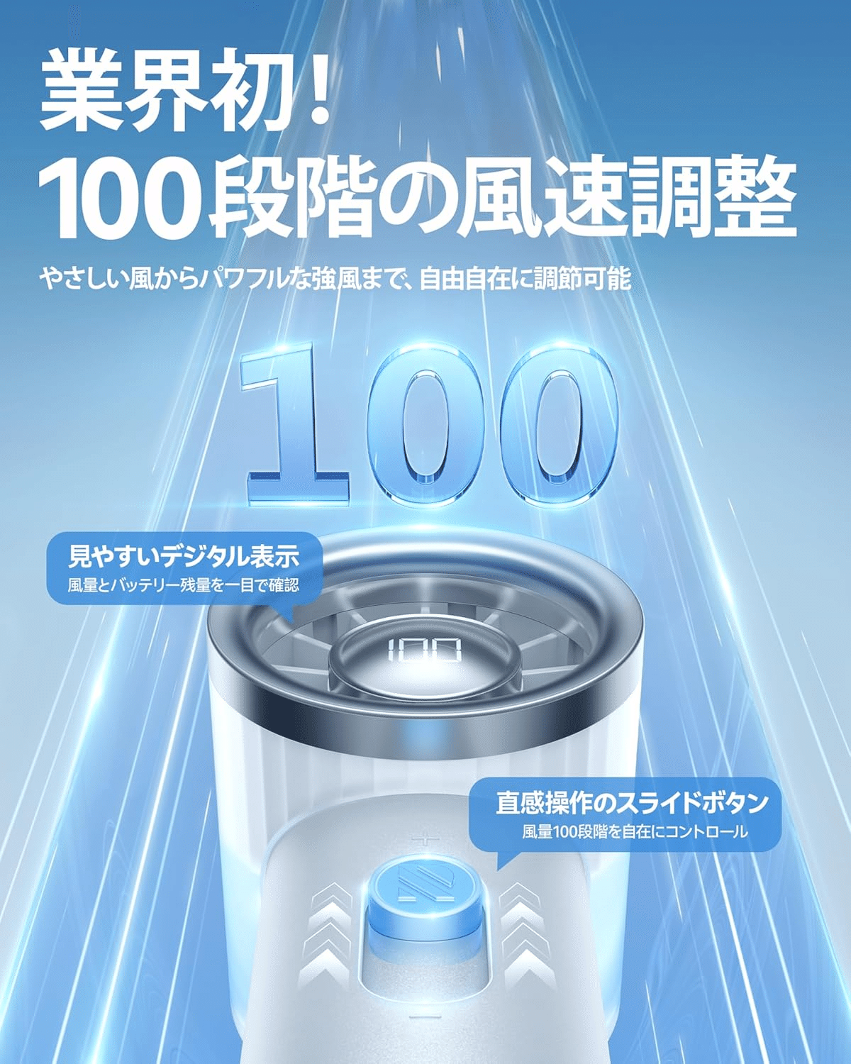 業界初!100段階の風速調整 – RANVOO ハンディファン アイスブルー 超軽量強風